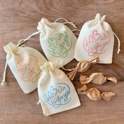 ・巾着袋は、らぼんのロゴが、①グリーン②オレンジ③ブルー④ピンクの4色。サイズは、縦14cm×横10cm。飴玉を入れたり、イヤホンを入れたり、小物入れにも便利。